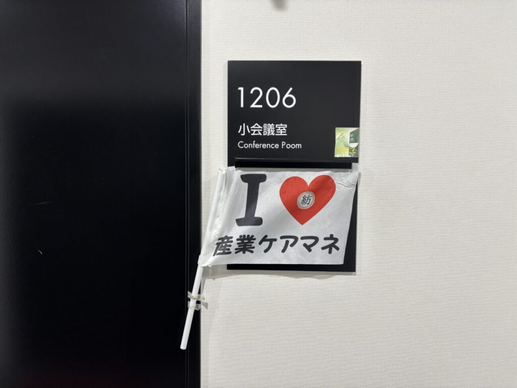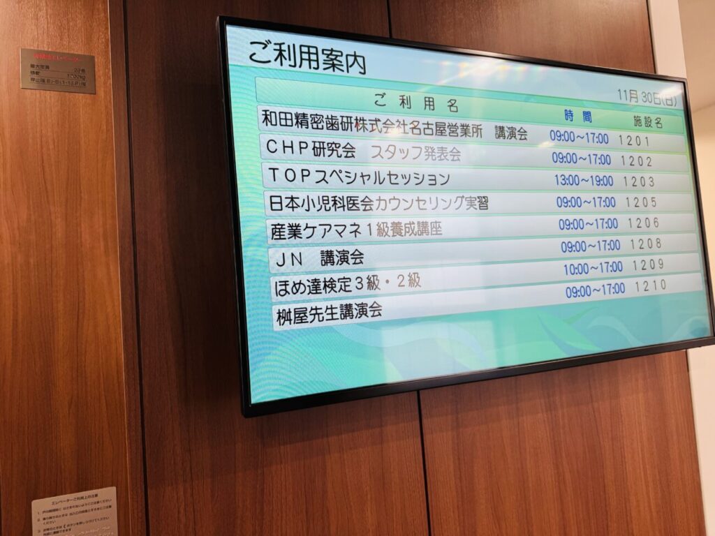 会場案内のモニターにも「産業ケアマネ1級養成講座」の文字がバッチリ掲載され、